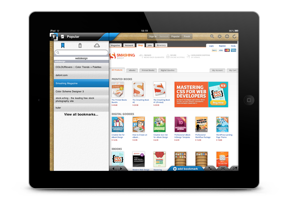 The DBD iPad App designed by Studio Kmzero with Nuuxo, allows the user to access his recent del.icio.us or Pinboard bookmarks, browse them and add new bookmarks.